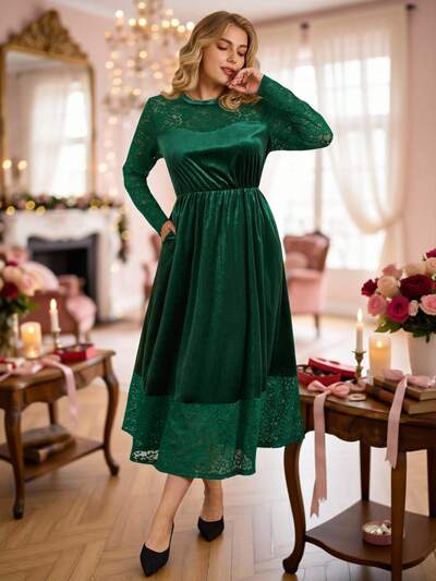 Plus Size Elegant Party Solid Color Lace Patchwork Dress Green Elegant Dress Women Party Dress Women Dresses Autumn Winter Christmas Clothes New Year Clothes Elegant Dress Women Stylish Clothing Collection Elegant Dresses For Party Elegant Party Clothes For New Year Christmas Clothes For Women Winter Clothes For Women