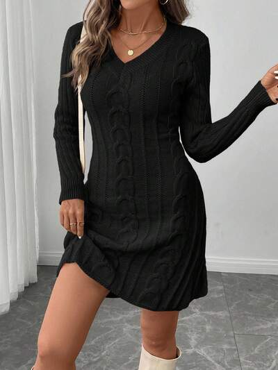 Plus Size Solid Color V-Neck Long Sleeve Knit Casual Sweater Dress,Black Dresses For Women ,Winter Dresses For Women,Women's Winter Sweater,New Year Women's Clothes,Elegant Party Outfit,Casual Outfit For Women New Year Dress Black Dress Maija Fall Winter 2025 Fall/Winter Party