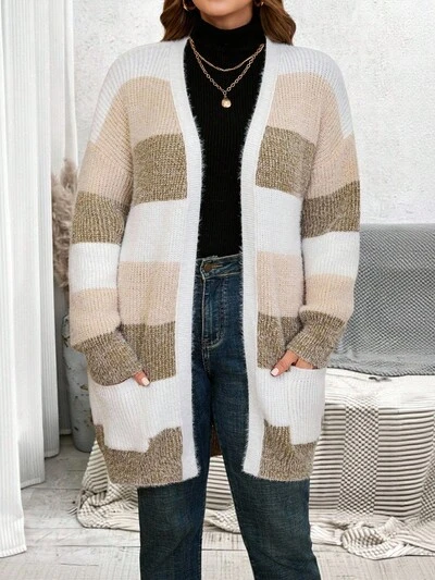 Plus Size Simple Striped Contrast Color Cardigan Color Block Cardigan Striped Cardigan Long Cardigan,Autumn/Winter,2025 New