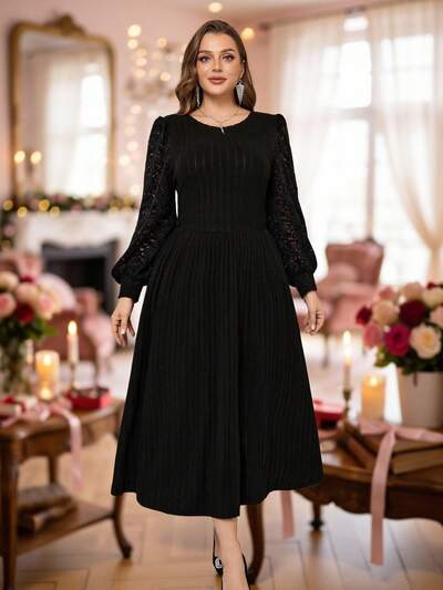 Plus Size Minimalist Solid Color Lace Pleated Hem Dress For Christmas, Lace Sleeve Dress, Long-Sleeved Black Dress, Elegant Black Dress, Black Midi Dress, Women's Winter Dress, New Year's Women's Wear, Elegant Party Outfit, Women's Black Dress, Carnival New Year's Look Sparkly Dress, Black Dress, Plus Size Elegant Black Dress, 2025 Autumn/Winter Collection, Autumn/Winter Party Elegant Dress.