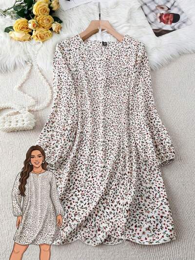 Plus Size Floral Allover Print Short Crew Neck Long Sleeve Dress Winter Clothes Flower Print Dress Ditsy Floral Dress Wildflower Dress Long Sleeve Summer Dress Cottagecore Dress