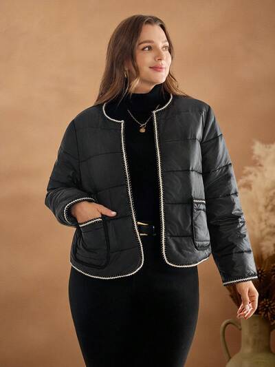 Plus Size Contrast Trim Pocket Casual Everyday Padded Coat Black Quilted Jacket Jacket With Trim Plus Size Black Quilted Jacket Autumn/Winter,2025 New
