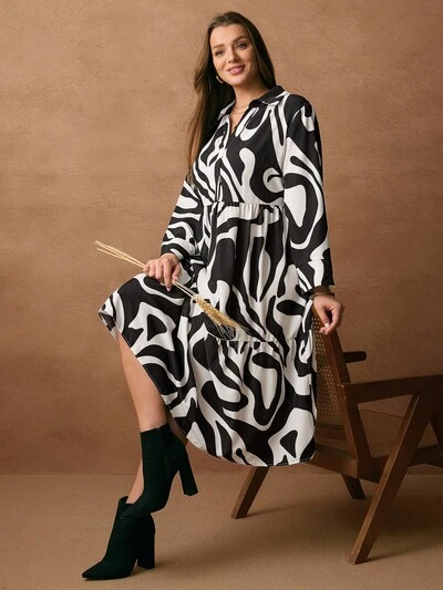 Plus Size Casual Minimalist Lantern Sleeve Asymmetrical Pattern Print Mid-Length Waist Cinched Dress Women Long Sleeve Dress Autumn/Winter,2025 New