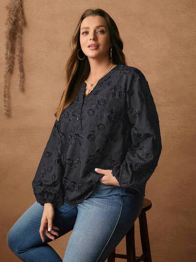 Plus Size Floral Embroidery Casual Vacation Shirt,Black Tops, Winter Clothes For Women, Christmas,Black Tops,Plus Size Winter Clothes Elegant Casual