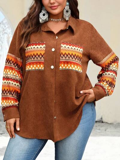 Plus Size Women Autumn Casual Embroidery Stripe Patchwork Long Sleeve Pockets Brown Shirt Shacket, Western Wear,Autumn/Winter,Fall,Vacation Women,Simple And Fashionable For Everyday Wear,Vacay Vibes,Going Out, Fall