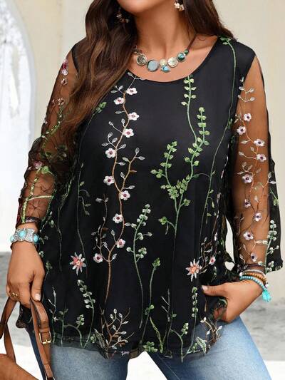 Plus Size Women Floral Embroidery Round Neck 3/4 Sleeve Black Casual Blouse Top,Fall,Summer Holiday,Vacation Women,Simple And Fashionable For Everyday Wear,Vacay Vibes,Bohemia,Going Out Tops Women,Western Wear