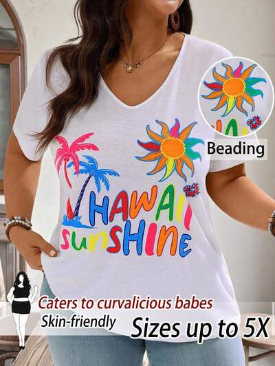 Plus Size Summer Beach Vacation Loose Printed Short Sleeve T-Shirt,Fall,Graphic Tees,Back To School,Country Concert,Old Money Style Women,Going Out Tops Women,Rave,Boho,Rave Festival