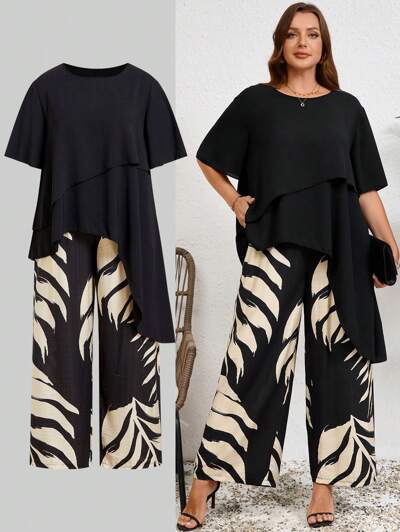 Plus Size Women's 2 Pieces Set Black Asymmetric Long Elegant Shirt And Colorful Leaf Pattern Pants Bohemian Style Two Pieces Set Suitable For Spring And Summer Wear Women Plus Clothing Business Casual Work Clothes Women Professional Women Clothes Vacation Two Pieces SetSummer Outfits For Women
