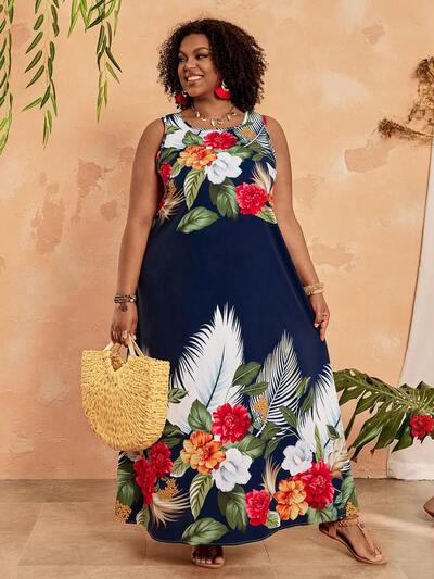 Women's Plus Size Sleeveless Round Neck Positioning Floral Breathable Dress, Summer Fashion, Tunic Tops, Summer Fashion Women's Summer Dresses, Women's Festival Dresses, Women's Brunch Dresses, Women's Business Casual Dresses, Women's Going Out Tops, Women's Wedding Guest Dresses,Work Clothes Women,Floral Dress Women