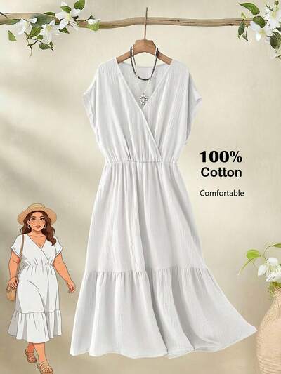 Plus Size Women's Summer Casual Vacation Country Short Sleeve Solid Color White Mid-Length Dress, Comfortable & Relaxed,Plus Size Women's Summer Casual Vacation Country Short Sleeve Solid Color Mid-Length Dress, Comfortable & Casual/Summer,Comfortable And Breathable,Summer Holiday,Spring Break Outfits ,Vacation Outfits Women ,Holiday Outfits For Women,Going Out Outfits,2026 New Clothes,Simple And Fashionable For Everyday Wear,Casual Dresses For Women,Flowy Dress ,Suitable For Summer, Vacation, Commute, Daily Wear Cottagecore Dress Solid Color Dress,Vacation, Daily Wear, Festival Outfits For Women,Country Concert Outfit,Beach Outfits For Women,Western Style