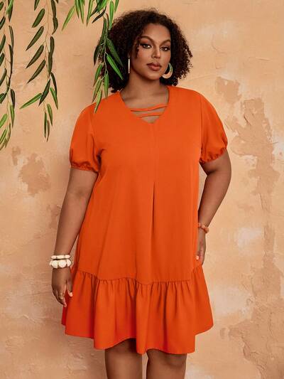 Plus Size Women Solid Color V-Neck Short Petal Sleeve Ruffle Hem Vacation Dress Women's Plus Size Dresses Women's Holiday Clothes Plus Size Dress Vacation Women's Summer Outfits Summer Outfits Summer Clothes Spring Dress Spring Outfit Women Spring Clothing Beach Vacation Outfits For Women Vacation Dress Bohemian Festival Outfits For Women Beach Outfits For Women