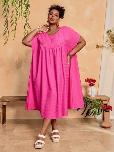 Plus Size Women Casual Solid Color Round Neck Short Sleeve Button Design Dress