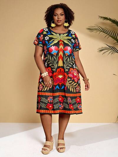 Plus Size Women's Casual Plant Print Short Sleeve Dress,Plus Size Women Summer Clothes African Print Clothes Women's 2 Pieces Sets Women's Summer 2 Pieces Sets Women Vacation Outfit Sets Women Clothes Sets Women's Plus Size Dresses Tropical Outfit For Women Plus Size Plus Size Summer Dresses Plus Size Vacation Outfits Plus Size Cruise Outfits For Women Bubu Dress Bubu Dress For Ladies African Clothes For Women Jamaican Dresses Women