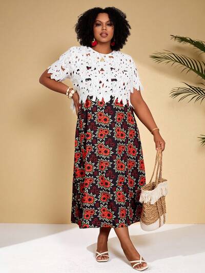 Plus Size Women Lace Patchwork Floral Print Dress, Summer Vacation Outfits Women Curve