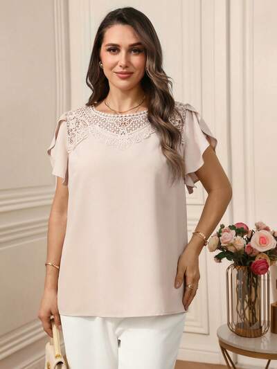 Plus Size Women's Summer Casual Vacation Elegant Casual Lace Patchwork Flare Sleeve Apricot Round Neck Short Sleeve Blouse Top Shirt, Spring/Summer,Summer\Vacation,Summer Holiday,Spring Break Outfits ,Vacation Outfits Women ,Holiday Outfits For Women,Going Out Outfits,2026 New Clothes,Simple And Fashionable For Everyday Wear,Suitable For Summer, Vacation, Daily Wear