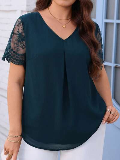 Plus Size Women's Elegant Lace Patchwork Blouse, Summer,Summer Dresses For Women,Spring Outfit Women ,Elegant Women's Blouses,Vacation Outfits Women,Work Outfits For Women,Peplum Top,Green Top Plus Size Blouses For Women Lace Trim Top Plus Size Short Sleeve Tops Curve Plus Blouses Sheer Top Plus Size Teal Plus Size Top Blouse For Women Elegant Blouses For Women Plus Size Elegant Plus Size Formal Top Blouse For Women Plus Size Women Plus Size Tops Blouses For Women Elegant Casual Elegant Blouse Blouse For Women Casual Elegant Women's Tops And Blouses Women's Short Sleeve Tops Blouse With Lace Sleeves