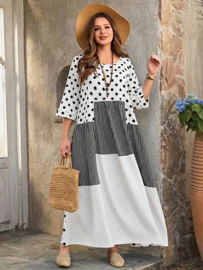 Plus Size Women's Summer Casual Vacation Country Round Neck 3/4 Sleeve Polka Dot, Plaid & Striped Patchwork Dress, Summer/Spring, Plus Size Polka Dot Dress,Summer\Vacation,Summer Holiday,Spring Break Outfits ,Vacation Outfits Women ,Holiday Outfits For Women,Going Out Outfits,2026 New Clothes,Simple And Fashionable For Everyday Wear,Suitable For Summer, Vacation, Daily Wear,Suitable For Summer, Vacation, Daily Wear,Dresses For Women,Flowy Dress ,Beach Outfits For Women,Casual Vacation Boho Dress, Long Summer Dress Plus Size, Vacation Plus Size Women Dresses,