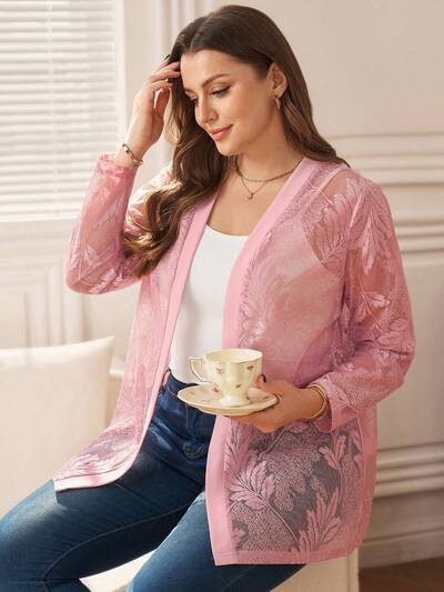 Plus Size Women's Summer Casual Vacation Pink Long Sleeve Jacket, Summer\Vacation,Summer Holiday,Spring Break Outfits ,Vacation Outfits Women ,Holiday Outfits For Women,Going Out Outfits,2026 New Clothes,Simple And Fashionable For Everyday Wear,Suitable For Summer, Vacation, Daily Wear, Pink Cardigan For Women, Lace Cardigan, Lightweight Cardigan