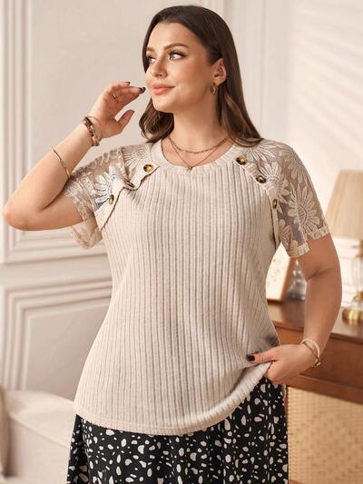 Plus Size Women's Summer Casual Vacation Lace Patchwork Button Design Short Sleeve T-Shirt Top, Apricot Color,Summer\Vacation,Summer Holiday,Spring Break Outfits ,Vacation Outfits Women ,Holiday Outfits For Women,Going Out Outfits,2026 New Clothes,Simple And Fashionable For Everyday Wear,Suitable For Summer, Vacation, Daily Wear, Beige Tops For Women, Women Short Sleeve Tops, Laced Tops