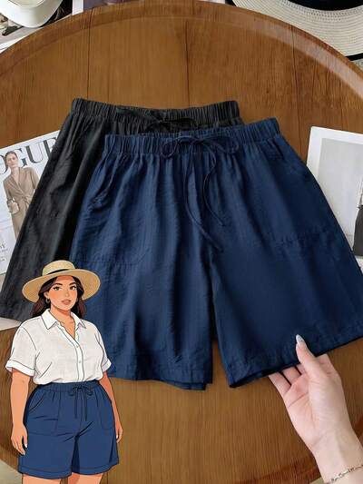 Plus Size Women's Casual Solid Color Shorts, Summer,Summer Outfits,Spring Clothes Women,Going Out Outfits,Holiday Outfits For Women,Casual Outfit For Women,Beach Vacation Outfits For Women Shorts Women Summer Shorts Casual Shorts Wide Leg Shorts Loose Shorts Women's Shorts Summer Work Shorts For Women Women's Casual Shorts 2pcs Shorts