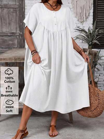 Plus Size Women's Solid Color Round Neck Short Sleeve Button Half Placket Casual Loose Dress