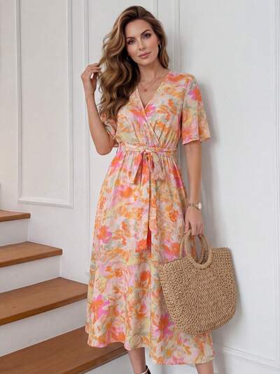 Floral Print Flower V Neck Tie Waist Flowy Midi Dress Elegant Casual Summer Beach Vacation Outfit Floral Dress Flower Print Summer Dress Beach Dress Vacation Dresses Casual Dresses For Women Elegant Dresses For Women,Summer Holiday Outfits,Graduation Outfit For Mother Floral Long Dress,Summer Outfits For Women