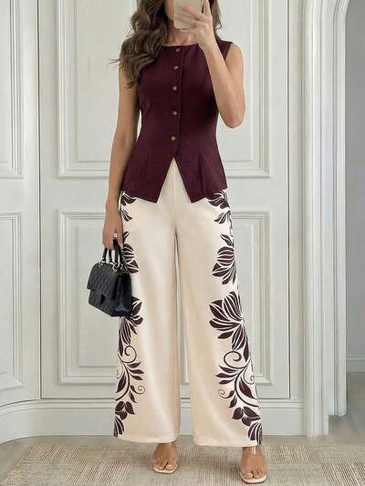 Burgundy Red Sleeveless Peplum Top Floral Print Flower Wide Leg Pants Set Elegant Formal Party Outfit Two Piece Set Red Dress Red Top Floral Dress Flower Print Elegant Dresses For Women Formal Dresses For Women Party Dresses For Women,Summer Set,Graduation Outfit For Mother,Summer Outfits For Women