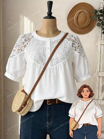 Plus Size Women Solid Color Lace Patchwork Blouse,Spring Clothes Women,Vacation Outfits Women ,Casual Blouses For Women ,White Blouse,Holiday Outfits For Women,Beach Vacation Outfits For Women Lace White Top White Boho Top Blouse Summer Plus Size Blouses White White Plus Size Tops White Lace Top Women's White BlouseTops Women Elegant Casual Blouse Blouse Summer Tops New Arrival Blouse Latest Tops For Women French Style Blouse Elegant Blouse Blouse For Women Blouse For Women Casual Elegant Women's Tops For Summer Latest Tops For Women New Arrivals Women's Tops And Blouses