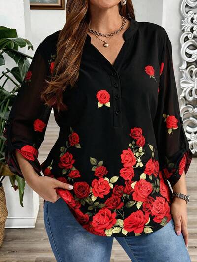 Plus Size Casual Rose Print Shirt/Summer/Vacation Half Button Beach Blouse Formal Attire New Arrival Blouse Women's Tops And Blouses Plus Size Shirts For Women Summer Outfits For Women Beach Outfit For Women Casual Vacation Outfits Women Country Concert Outfit Peplum