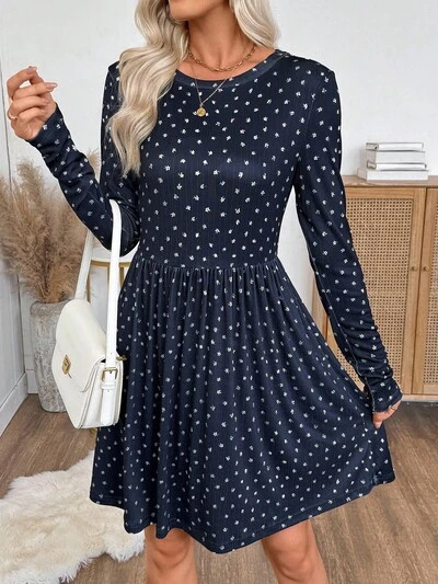 Vestido corto de manga larga con cuello redondo y estampado floral diminuto para mujer