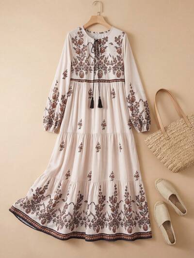 Vestido maxi elegante de manga larga con cuello en V y estampado floral, para vacaciones