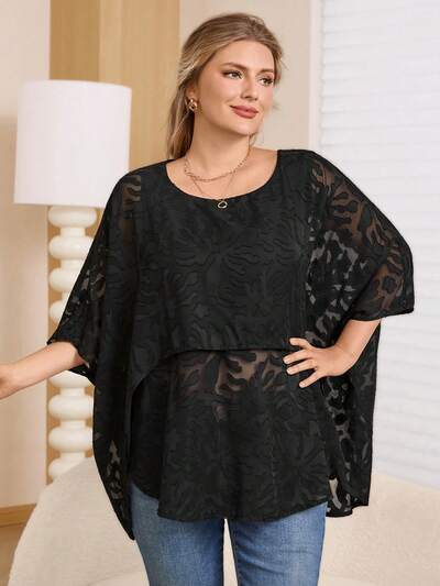 Plus Size Women Summer Vacation Sheer Jacquard Mesh Batwing Sleeve Loose Blouse Valentine's Day Plus Size Black Tops,Flower/Spring-44%