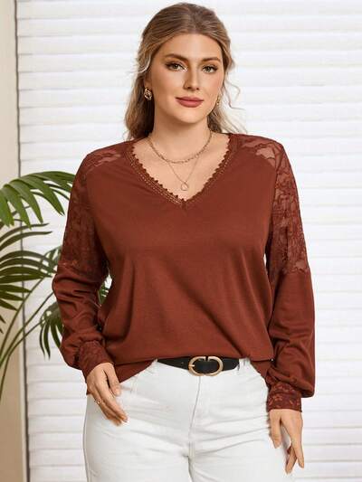 Plus Size Women V-Neck Long Sleeve Lace Patchwork Brown T-Shirt-38%