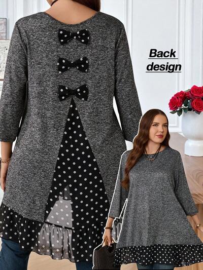 Plus Size Women's Fall/Early Spring Casual Fashion Vacation Grey Polka Dot Print Patchwork T-Shirt With Bow Decor And Ruffle Hem,Valentine's Day,Going Outs,2026 New ,Simple And Fashionable For Everyday Wear, New ,Spring For Women, Plus Size Tunics, Tunics For Women, Grey Tops For Women, Gray Tunics, Tunic Tops For Women,Vacations Women ,Holidays For Women,Spring Women,Valentine's Day ,Valentines For Women ,Short In Front And Long In Back Hem,Flower/Summer-32%