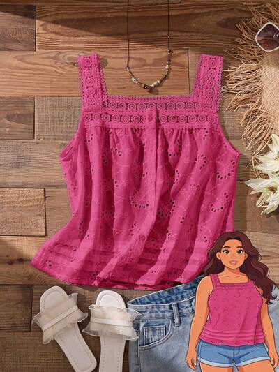 Plus Size Women's Summer Casual Vacation Country Lace Patchwork Spaghetti Strap Backless Embroidered Rose Pink Blouse,Plus Size Women's Summer Casual Vacation Country Lace Patchwork Open Back Embroidered Solid Color Rose Pink Sleeveless Blouse, Summer Holiday,Spring Break,Vacation,Going Out,2026 New,Simple And Fashionable For Everyday Wear,Casual Vacation Boho Top,Suitable For Summer, Vacation, Commute, Daily Wear,Festival Outfits For Women,Country Concert Outfit,Beach Outfits For Women,Western Style-42%