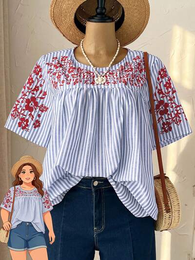 Plus Size Women's Summer Casual Vacation Country Floral Embroidered Short Sleeve Casual Blouse Top Shirt,Boho For Women/Summer,Summer Outfits For Women ,Vacation Outfits Women ,Holiday Outfits For Women,Going Out Outfits,2026 New Clothes,Simple And Fashionable For Everyday Wear,Suitable For Summer, Vacation, Daily Wear, Festival Outfits For Women,Country Concert Outfit,Beach Outfits For Women,Western Style,Going Out Tops-33%