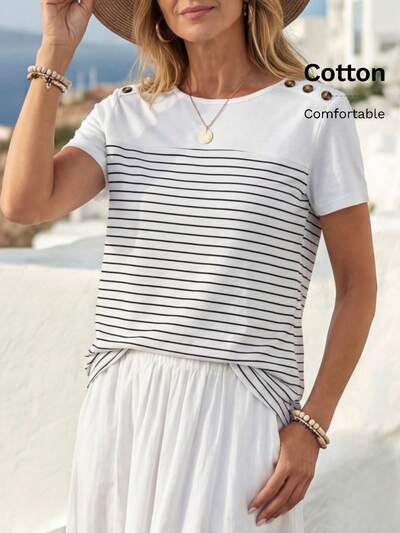 Summer Women's Round Neck T-Shirt With Decorative Buttons, Color Block & Striped Patchwork, Casual & Holiday Style,Graphics Woman T Shirts Fall Clothes Emery Rose Funny T Shirt,-49%