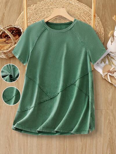 Button Detail Solid Round Neck Short Sleeves Curved Hem Tee,Casual-43%