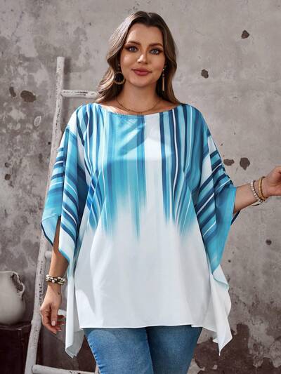 Plus Size Women's Summer Casual Vacation Country Ombre Round Neck Short Sleeve Batwing Sleeve Gradient Print Loose Fit Blouse, Spring/Summer/Vacation,Holiday,Spring Break,Vacation,Going Out,2026 New,Simple And Fashionable For Everyday Wear, Suitable For Summer, Vacation,Daily Wear, White And Blue Top, Beach Tops For Women-50%