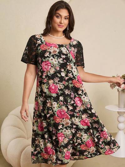 Plus Size Elegant Floral Print Lace Panel Summer Dress-41%