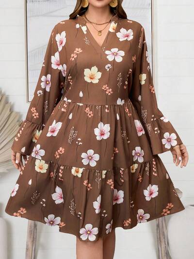 Plus Size Casual Floral Print Flare Sleeve Dress,Vacation Wear,Spring,Boho Dress Women-27%