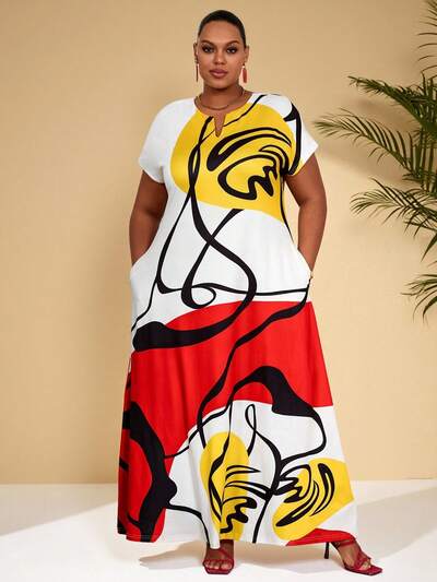 Plus Size Women Color Block Casual Party Vacation Dress, Suitable For Summer Summer Dress Summer Outfits Summer Clothes Spring Dress Spring Outfit Women Spring Clothing Floral Dress Floral Dresses For Women Beach Vacation Outfits For Women Vacation Dress Bohemian Summer Holiday Outfits-42%