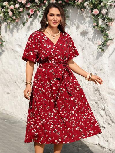 Plus Size Women's Summer Casual Vacation V-Neck Short Sleeve Red Ditsy Floral Print Casual Vacation Dress With Belt,Summer Holiday,Spring Break Outfits ,Vacation Outfits Women ,Holiday Outfits For Women,Going Out Outfits,2026 New Clothes,Simple And Fashionable For Everyday Wear,Flowy Dress ,Suitable For Summer, Vacation, Daily Wear, Red Dresses For Women ,Beach Outfits For Women ,Wedding Guest Dress For Women ,Party Dresses-45%