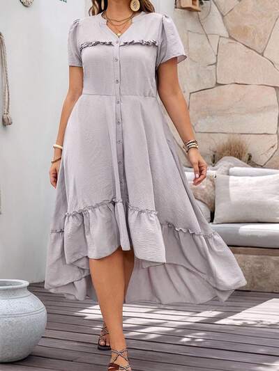 Plus Size Women's Solid Color V-Neck Short Sleeve Ruffle Hem Casual Dress-60%