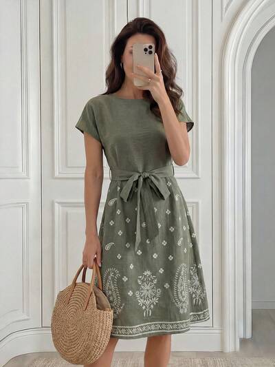 Women's Casual Round Neck Cap Sleeve Cashew Print Dress,Summer Dresses For Women Dress For Women Casual Dresses For Women Summer Elegant Dress For Women New Arrival Zanea Dress,Summer Dress,Beach Outfits For Women,Vacation Outfits Women,Green Dress-42%
