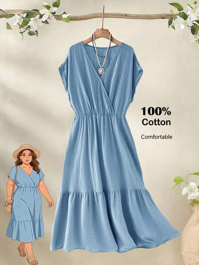 Plus Size Women's Summer Casual Vacation Country Short Sleeve Solid Color Blue Mid-Length Dress, Comfortable & Relaxed,Plus Size Women's Summer Casual Vacation Country Short Sleeve Solid Color Mid-Length Dress, Comfortable & Casual/Summer,Comfortable And Breathable,Summer Holiday,Spring Break Outfits ,Vacation Outfits Women ,Holiday Outfits For Women,Going Out Outfits,2026 New Clothes,Simple And Fashionable For Everyday Wear,Casual Dresses For Women,Flowy Dress ,Suitable For Summer, Vacation, Commute, Daily Wear Cottagecore Dress Solid Color Dress,Vacation, Daily Wear, Festival Outfits For Women,Country Concert Outfit,Beach Outfits For Women,Western Style-26%